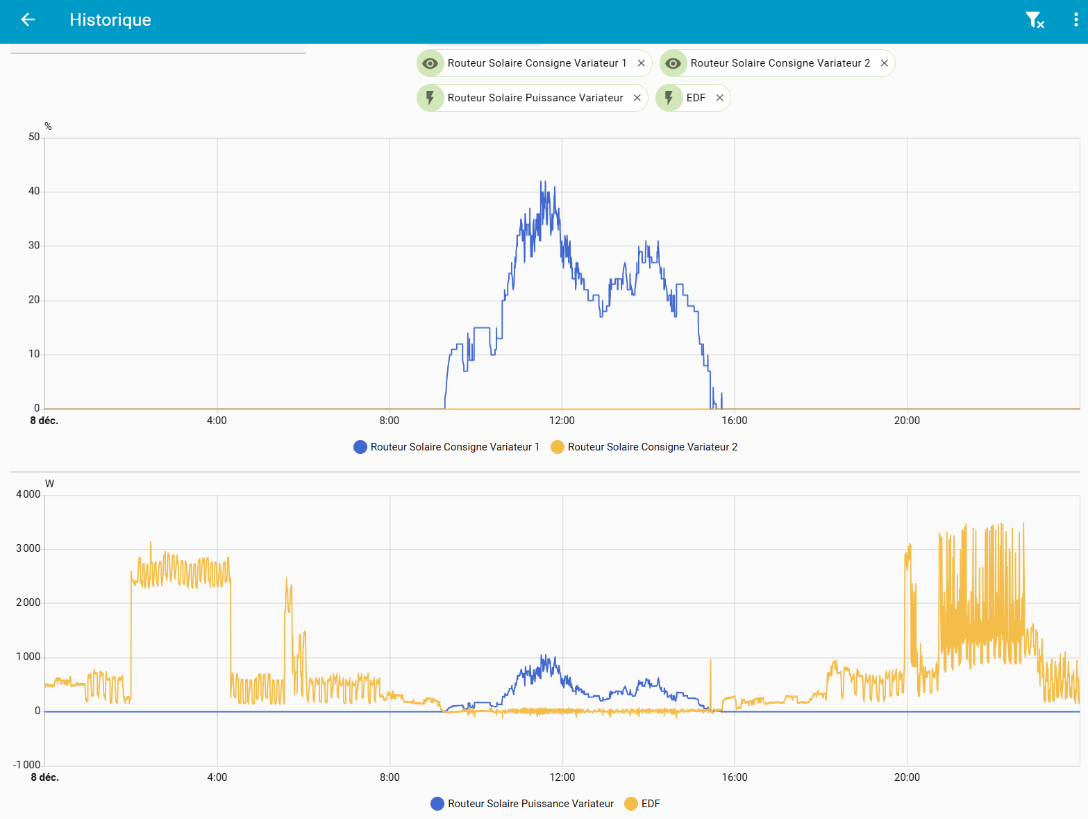Pour analyser ta capture d’écran, peux-tu partager l’historique avant et après cette capture, avec les entités Consigne, Var1, Var2, ainsi que la puissance EDF et le variateur, comme ci-dessous