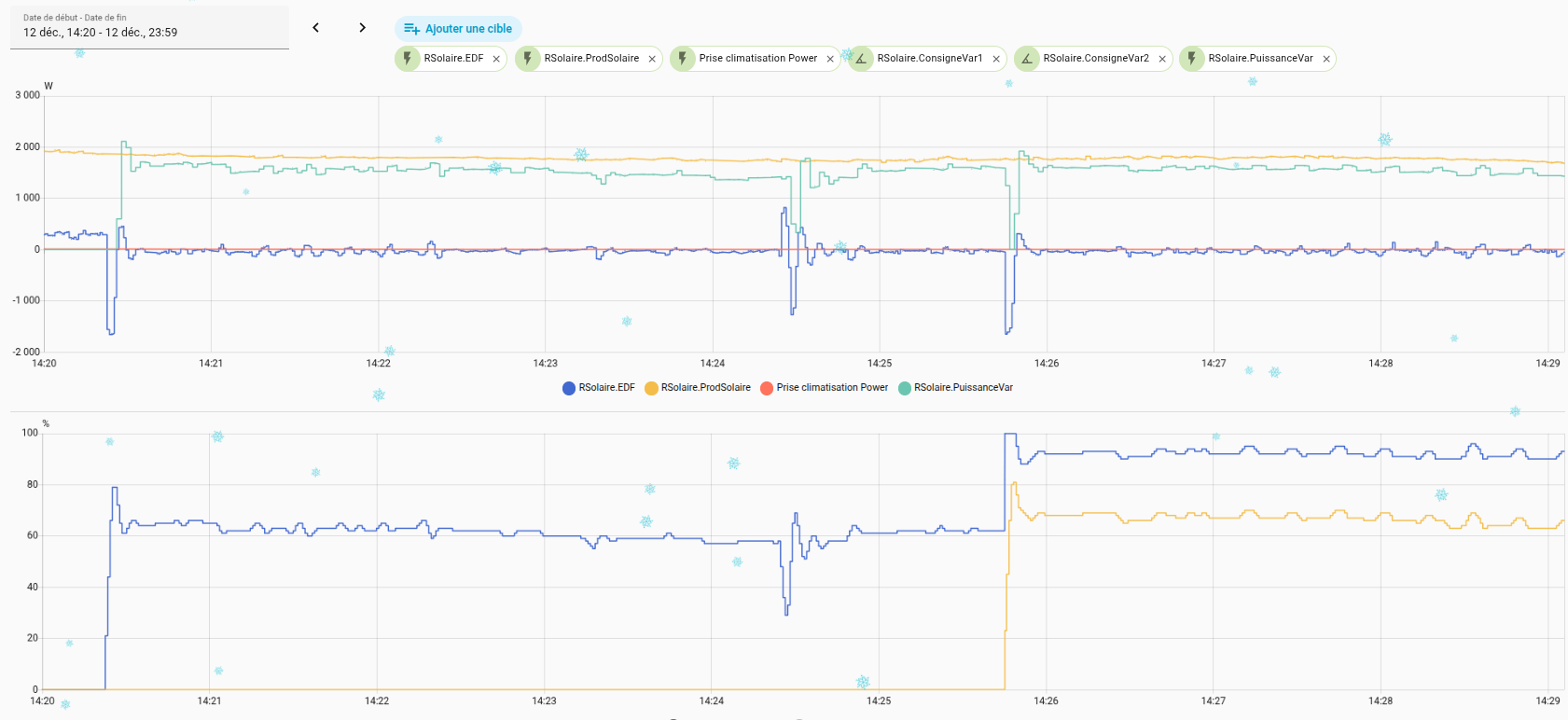 À partir de 14h25... , on voit que le thermostat du cumulus vient de s’ouvrir (la température de l’eau a atteint la consigne).