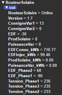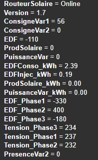 J'ai la valeur ConsigneVar1=13. Ok, soleil léger ce matin. Mais la valeur PuissanceVar=0 n'est pas juste. J'ai un compteur en sortie de variateur pour compter ce que j'injecte dans mon chauffe eau. Et j'injecte bien. Donc valeur =0 n'est pas juste.