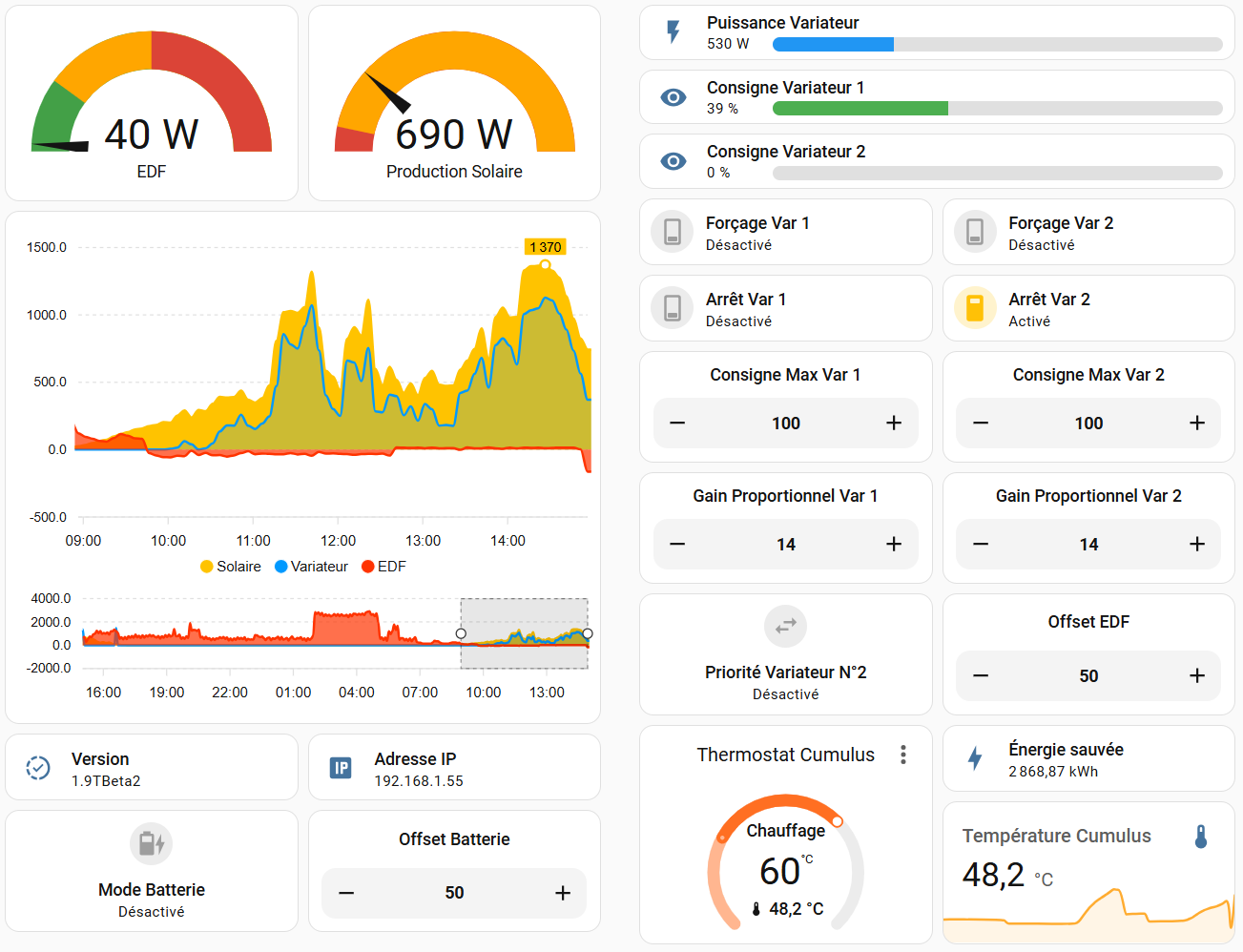 PS : Depuis dimanche, je teste la V1.9 😉 (nouvelle régulation, plus d’impact sur le Var 2 quand vous coupez l’alimentation électrique du Var 1, remontée de l’adresse IP du routeur, possibilité de modifier les gains proportionnels des deux variateurs -> surtout utile pour ceux qui ont monté des variateurs en parallèle, charge > 3 kW 🔥).