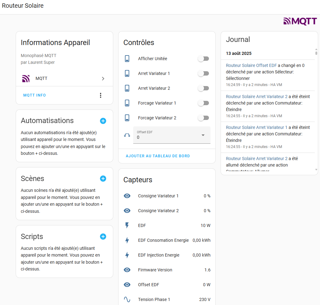 Citation de Laurent le 15 août 2025, 9h22Ah zut, j’ai oublié ces entités : voici le code YAML corrigé: https://routeursolaire.eu/wp-content/uploads/2025/08/YAML_TriLite_V1.6-.txt