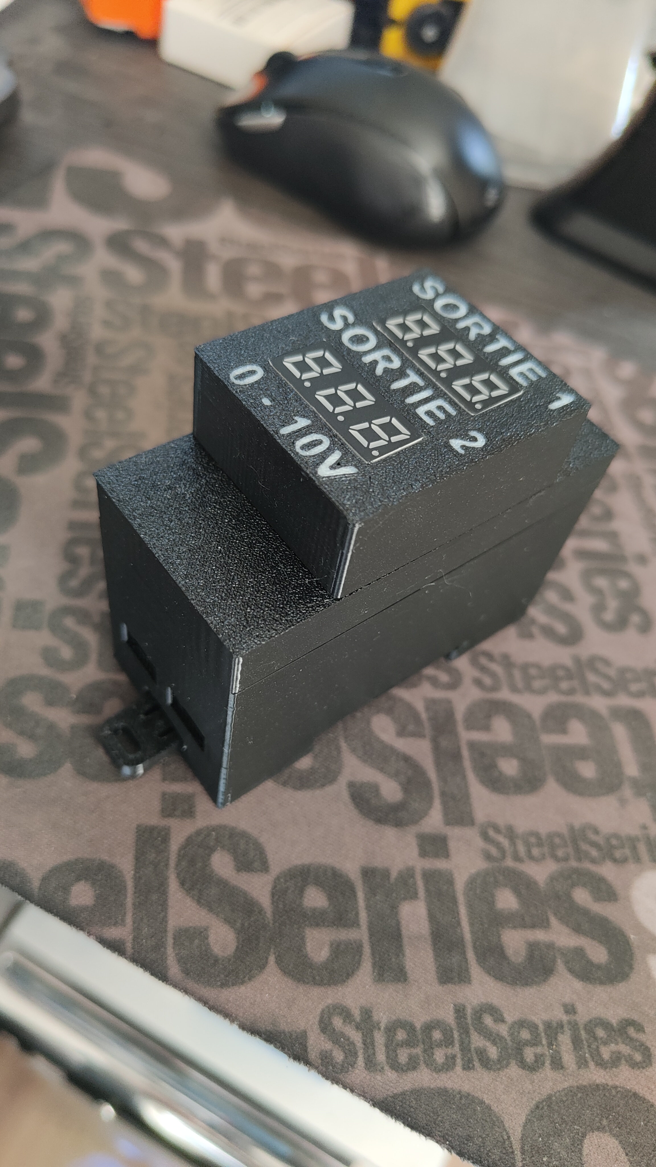 En façade, j’utilise 2 petites barres graphequi seront intégrées au boîtier imprimé en 3 D (format rail DIN ).