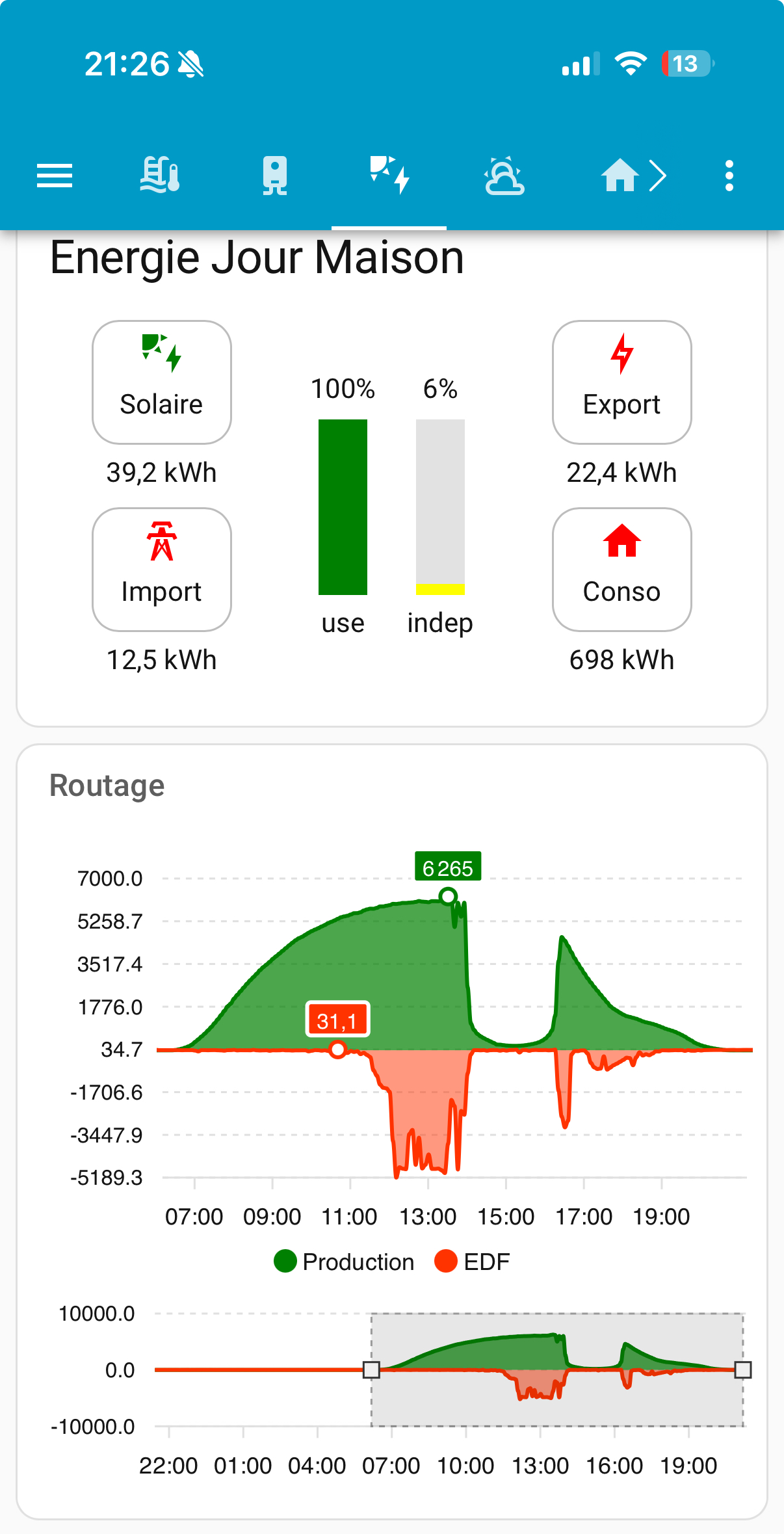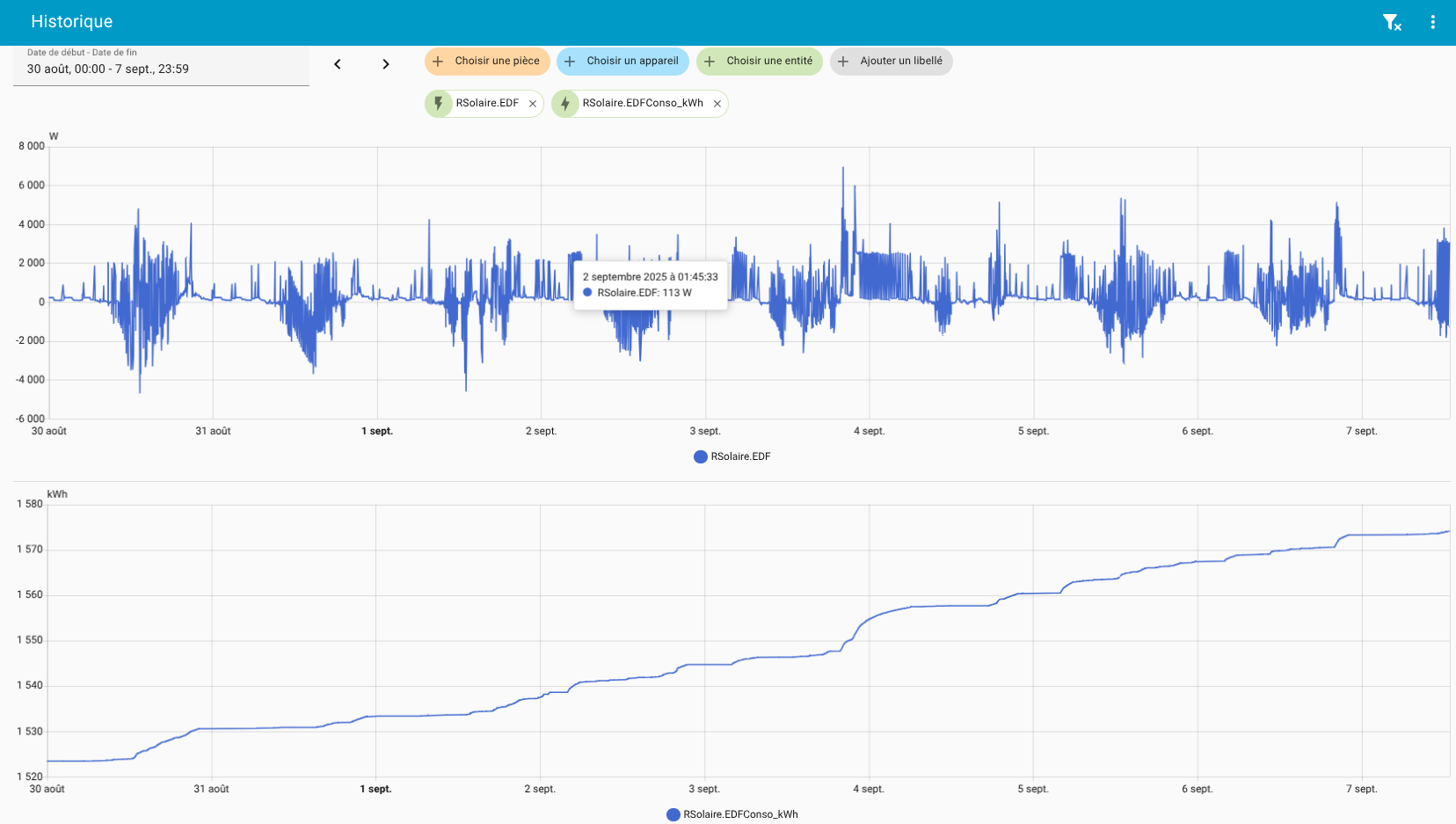 Peux-tu me partager ce même graphe sur deux jours et y ajouter l’entité edfinjec_kwh ainsi que la consommation des 3 phases?Et si un autre utilisateur d’un modèle tri sous HA (version 1.6) nous lit, je veux bien le même graphe 😉